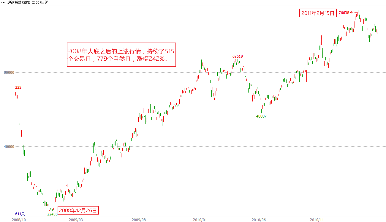 经历2008年的全球性金融风暴之后,铜自2008年12月26日见底之后走出了持续2年有余的震荡上行节奏,流动性持续泛滥、投资需求以及全球经济复苏驱动了铜价格的持续走高,历时515个交易日、779个自然日,达到了最大242%的涨幅,期间单月涨幅逾10%的有三个月,最大涨幅发生在2009年3月,达20%,最大跌幅为2010年1月的7.4%。