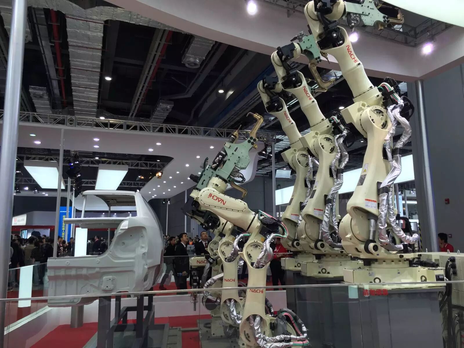 作为世界上技术领先的企业之一,那智此番还将一条智能化的汽车装备线的部分直接搬进工博会现场展示,两排6只高高举起的3关节机械手操作着对汽车的制造组装,观众需要抬头仰视,这成为那智展台的标志之一。