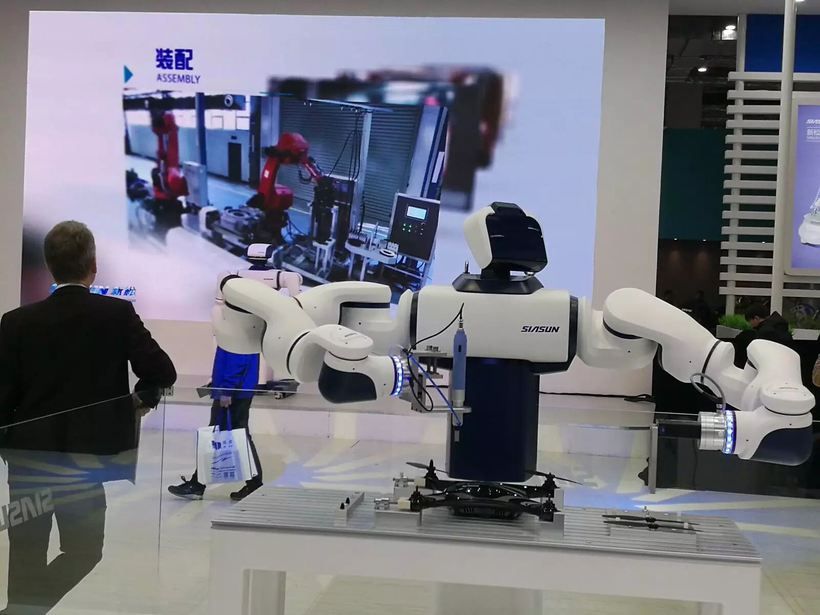 正如韩松林所言,在7H馆相对中心位置的中科新松被来自瑞士的ABB、德国的库卡、日本的那智等国际巨头的展位包围,站在各自的展位都能看到对方的智能机械装置和机器人——在韩松林身边站立的是比他还高大的新松双臂协作机器人,白色的它此时正在装配一台黑色小型无人机,分外醒目,灵巧的机械手可以把无人机的螺旋桨安上,全过程行云流水般地流畅。