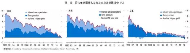 谢东海先生在会上表示,与萨默斯不同,伯南克认为全球储蓄过剩,全球范围内储蓄意愿大于投资意愿是造成长期低利率的重要原因。对于此,在原油价格下跌时,新兴市场国家贸易顺差缩小,外汇储备增速下降,全球储蓄过剩问题就会得到缓解。或是通过财政政策来扩大国家需求,从而减少储蓄率。正如下图所示,红线代表十年期国债收益率,浅色蓝线是对利率的期望值,深色蓝线则是期现溢价,美联储和IMF对国债期限溢价的测算,一定程度上印证了全球储蓄过剩理论,而2016年出现的离岸美元流动性下降及离岸美元成本上升也是全球储蓄过剩问题缓解的其中一个表现。