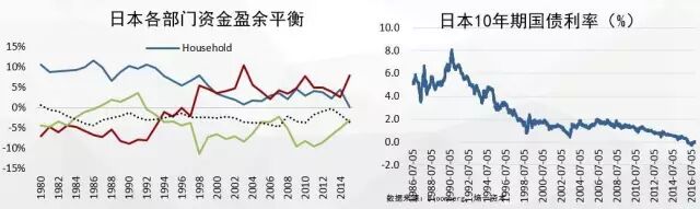 如上图所示,红线表明日本企业的资金状况,蓝线代表经济部门,虚线和绿线分别代表对外和政府。在图中可以看出日本企业从90年代后期开始不再借钱投资,反而开始存钱,而居民也在存钱,日本经济中的企业部门出现长期的投资缺失,这就是萨默斯所说的长期经济停滞、人口基数和结构变化导致需求不足,从而形成长期的低利率状态。