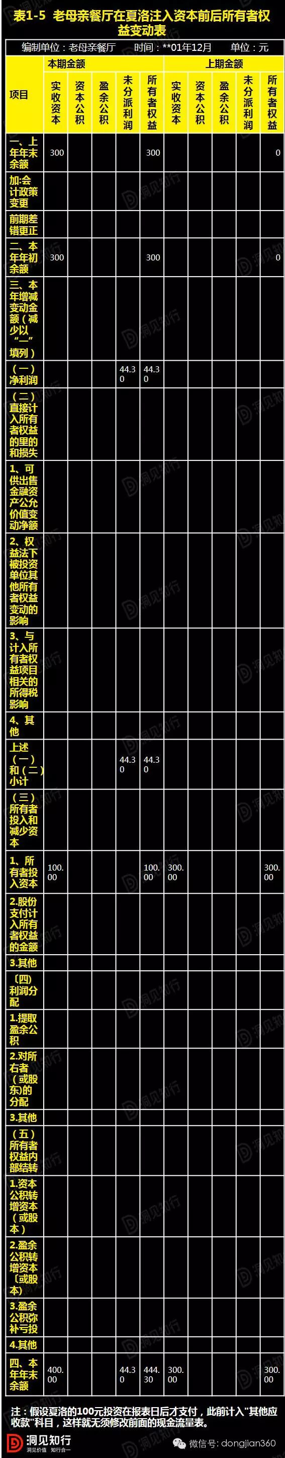 通过上表可以看出,经过一期经营和游说其他投资者加入,老母亲餐厅的所有者权益大幅增加,这种增加部分来源于有效经营,也有一部分来源于投资者的直接投入。同时,老母亲投资了300元,所占的股份由原来的100%,变化为75%。