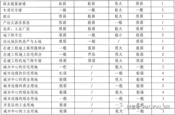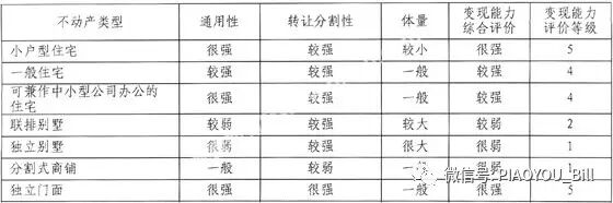 不同类型不动产的变现能力分析如下表所示,表中变现能力评价等级的得分越高,变现能力越强: