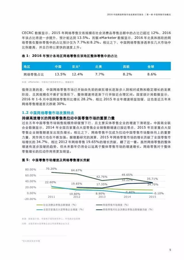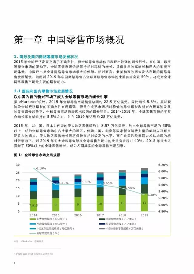 去年的全球零售总额约为22.5万亿美元(同比增长5.6%),中国占全球零售市场的比重约为两成,对全球零售业整体增长的贡献高达37%。去年全球网络零售规模同比增长约25%,高达1.67万亿美元左右,亚太地区不仅是全球零售市场最具活力的地区,同样也是网络零售市场增长最快的地区。