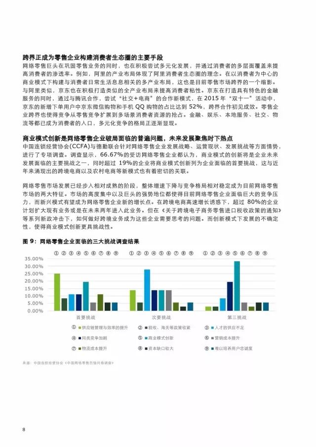 在德勤与中国连锁经营协会联合进行的针对网络零售企业的专项调查中显示,超过六成的受访企业认为,商业模式的创新将是企业未来发展所面临的主要挑战之一,近三分一的企业更是将此列为企业面临的首要挑战。