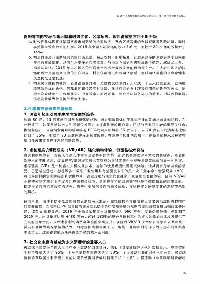 虽然如此,德勤中国消费品与零售行业主管合伙人龙永雄认为,“中国网络零售市场已开始由先前的疯狂增长逐渐步入相对成熟和稳定增长的发展阶段,在规模不断扩张的情形下,整体增速将逐渐下行并接近合理区间,这个市场也在逐渐向着规范化、品质化和多元化的方向演变。”