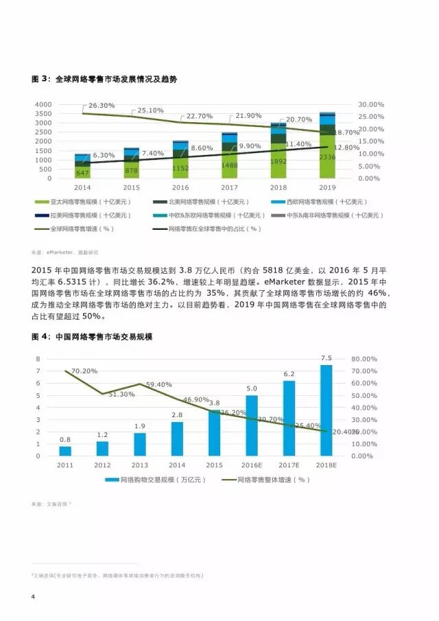 报告称,中国零售业消费市场体量巨大,凭借维持多年的高速增长,中国网络零售市场交易规模在去年达到3.8万亿人民币,同比增长36.2%,对全球网络零售市场占比和增长的贡献分别为35%和46%,稳居全球网络零售市场的首位。预计到2019年,中国网络零售占全球市场的比重更有望突破50%,成为全球网络零售市场的关键增长动力。