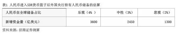 人民币正式成为SDR篮子货币对国际资本流入中国债券市场将产生显著的推动作用。人民币纳入SDR将在中期刺激外国央行和国际组织将人民币纳入其外汇储备资产,增加持有人民币,特别是增加对人民币债券的配置需求。根据国际货币基金组织最新披露的数据,日元和英镑在全球外汇储备中的比重分别是4.5%和4.7%。综合考虑人民币在SDR货币篮子中的权重等因素,我们预计,未来5年人民币在全球储备资产中的占比,乐观的估计可以达到4%,中性的预测为3%,较为悲观的预测为2%(见表1)。据此估算,未来外国央行持有的人民币资产最多将达到4600亿美元,较之目前1000亿美元左右的人民币储备资产存量,增加3600亿美元。如果考虑人民币国际化的继续推进和中国债券市场进一步开放后,国际性的共同基金、养老金、保险公司和商业银行等商业性机构也将增加持有更多人民币债券,则未来5年中国债券市场国际资本流入的规模应该会更高。
