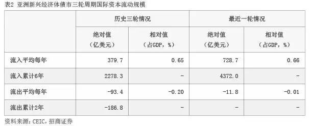 我们重点参考过去三轮周期波动中,债券市场国际资本流动与GDP平均比值的波动情况进行估算(见表2、表3、图2)。如果假定2016年开始新一轮周期,国际资本流入6年,流出2年,则未来的5年间中国债券市场将吸引4000至4400亿美元的国际资本流入。至2016年9月末,境外投资者在我国债券市场中的占比仅为1.3%,在国债市场中占比也仅为3.7%,远低于新兴经济体债券市场外国机构平均10%的占比和国债市场平均20%的外国机构占比。如果将上述估算的国际资本流入计算在内,到2020年,境外机构在中国债券市场中的占比仍不到4%,在国债市场中的占比也仍不到8%。这表明,以上对流入规模的估算比较合理,中国债券市场的国际资本流入潜力巨大。