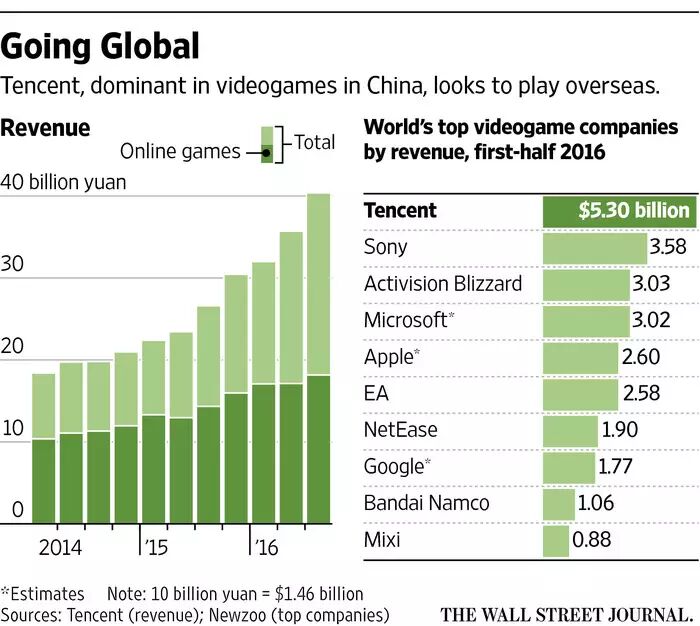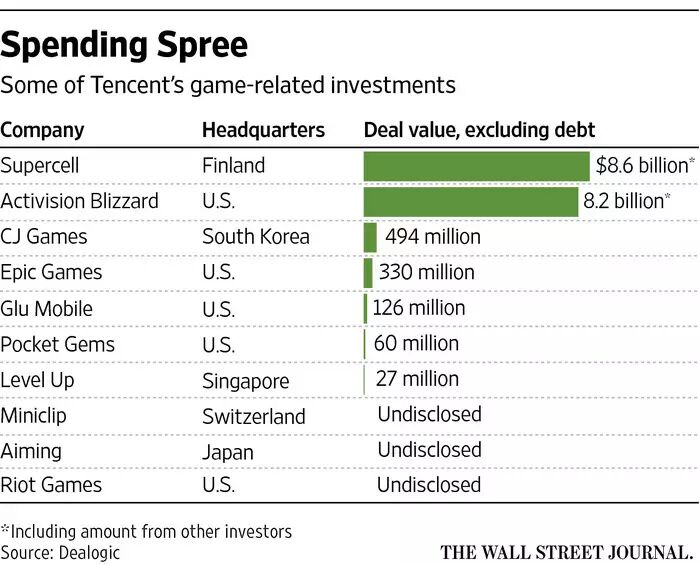 上月,腾讯再次加大了公司进军全球市场的努力。一个中国投资者财团完成了对芬兰游戏公司Supercell的86亿美元收购交易,这个财团由腾讯牵头。Supercell开发了几款在世界上颇受欢迎的手游,例如《部落冲突》。腾讯还是洛杉矶游戏开发商Riot Games的母公司,后者开发的《英雄联盟》是全球收入最高的PC游戏。