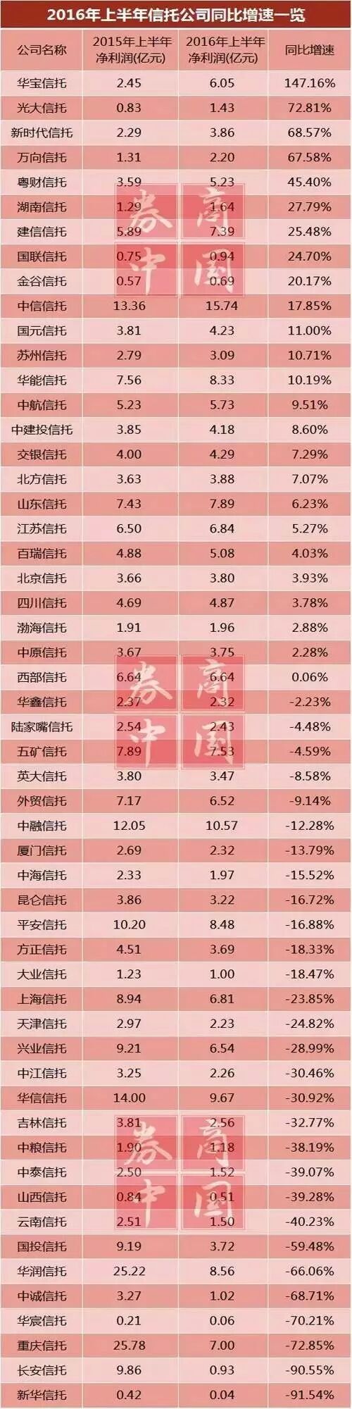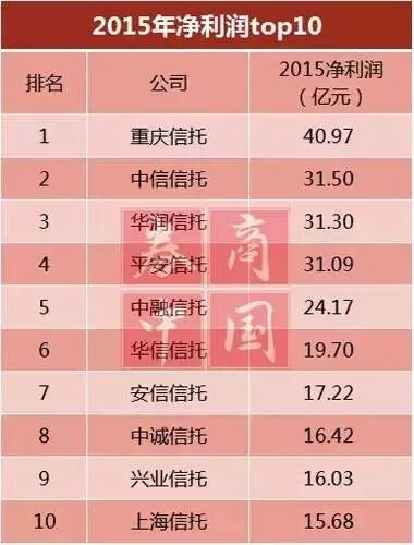 今年上半年信托业业绩普遍下滑,行业巨头排名也发生较大变化。例如,今年5月底,各家信托公司披露2015年年报,净利润排名前10名的公司分别为:重庆信托、中信信托、华润信托、平安信托、中融信托、华信信托、安信信托、中诚信托、兴业信托、上海信托。