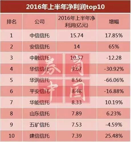 而查看今年上半年数据,多家公司排名发生较大变化。今年上半年净利润前10名公司分别为:中信信托、安信信托、中融信托、华信信托、华润信托、平安信托、华能信托、山东信托、五矿信托、建信信托。