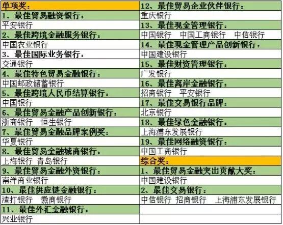 此外,第六届中国经贸企业最信赖的金融服务商颁奖典礼也在年会上颁发,作为业内最知名的交易银行生态圈奖项之一,第六届“中国经贸企业最信赖的金融服务商评选”自11月启动以来,先后经历了“面向企业发放问卷(微信线上填写问卷)、入围机构自评、专家评审”等环节,历时3个月之久,最终评选出22家2016年度在交易银行、贸易金融、财资、供应链金融、跨境金融、外汇、跨境人民币结算等多个业务领域表现突出的金融机构。多家业内优秀银行机构获得了荣誉。