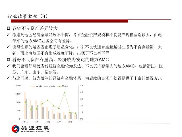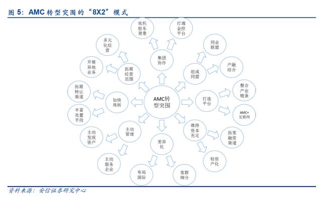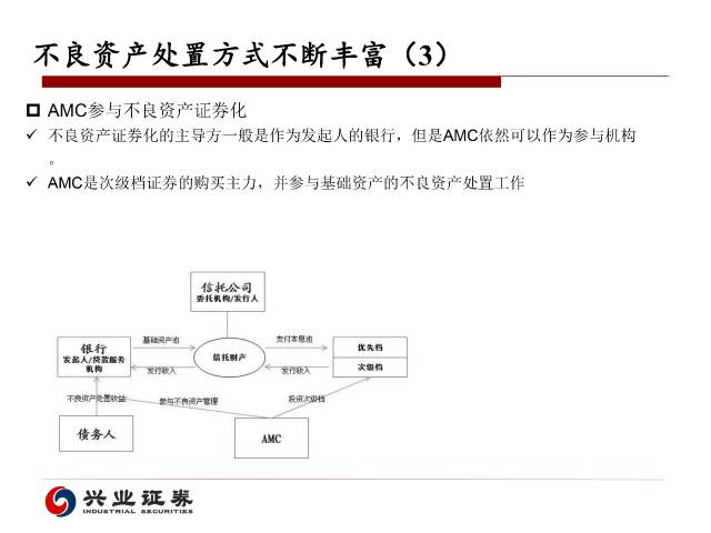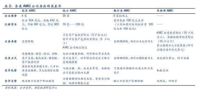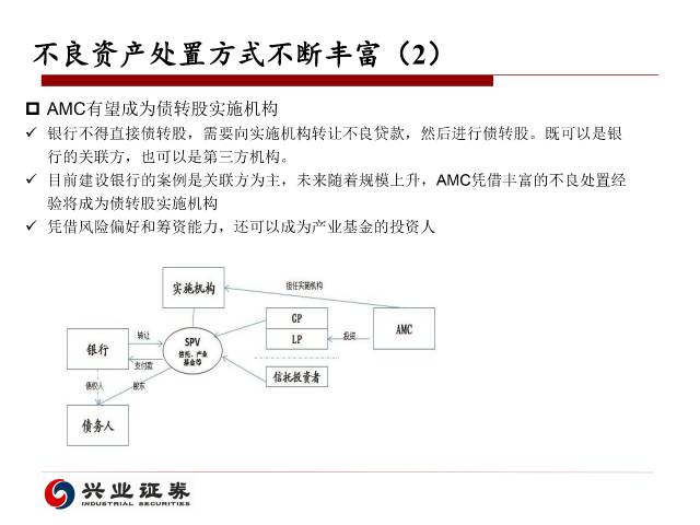 1 关注民营资本参股AMC的博弈性机会 关注民营资本控股或设立地方AMC带来的博弈性机会。除去港澳台外地方AMC最多可以设立62家,剩余的27席得到民营资本的热捧。有实力的民营资本希望通过控股或设立AMC公司,把握行业发展机遇,提升经营绩效。海德资管是目前唯一一家民营资本全资控股的地方AMC公司,除此之外,湖北资产管理公司、宁夏顺亿资产管理公司等多家地方AMC公司均有不同程度的民营资本参与其中,甚至于新获批的黑龙江嘉实龙昇金融资产管理公司股东中出现了公募基金子公司嘉实资本的身影。民营资本的加入使得公司运行机制较国有地方AMC更为灵活,操作更为市场化,在资本以及项目资源等方面具有独特优势。 AMC牌照价值还体现在业务来源渠道的稀缺性。只有拥有AMC牌照才能从金融机构承接不良资产的批量转让(新规门槛降至3户及以上),否则只能从AMC公司获得再转让或从金融机构处获得非批量的不良资产。四大AMC公司获取不良资产最为容易,吞吐和管理能力较强,因此对不良资产供应方的议价能力也强;地方AMC公司则在省内具有独特的地域优势,收购和处置渠道均较丰富;拟成立的五大行AMC子公司也有得天独厚的渠道优势,此轮新规也为其实现松绑。相比之下,非持牌的AMC公司虽然也可以做不良接收处置的工作,但中间往往需要经过AMC公司的再转让,成本端和规模均不具备优势,资产周转效率也偏低。 2. 银行系AMC将加入生态圈,公司开始分化 AMC的生态圈迎来银行系AMC,主营债转股业务。随着债转股新规的出台,政策鼓励商业银行成立专门的实施机构负责债转股,工行和农行均正式宣布拟成立资产管理公司,其余三大国有银行也呼之欲出。预计银行系AMC在成立之初将主要开展五大行的债转股业务,实施方式以相互交叉持股为主。鉴于银行系AMC缺乏不良资产管理经验,预计将会更多与四大AMC公司展开合作。 市场竞争加剧,公司出现分化。政策的松绑令全行业向更为市场化的竞争和运作发展,各类AMC公司将主动转型突围,开展错位竞争,从而打造自身的核心竞争力。从全行业来看,AMC公司的突围趋势主要有8个方向、16种模式,从内外两个层面展开,有能力的资产管理公司可同时沿用多个模式。对于不同的AMC主体,转型的方向将有差异。例如,四大AMC在多元化经营方面已有了较长时间的积累,他们的主要突围方向包括加强主动管理能力、开展差异化的竞争等。地方AMC公司结构比较单一,多元化经营突围在短期内难以实现,比较可行的方向是与同业、产业资本进行深度合作,依托股东背景利用好集团金控平台的优势,打造地方AMC的平台以及加快资产周转的速度。 现有政策思路或将延续。2016年3-4月,银监会规范了不良资产转让,打击了藏匿、利益输送等行为。10月10日国务院要求银行债转股只能对接AMC等实施机构,银行处理不良资产的需求大量释放。10月21日银监会正式允许地方AMC公司扩容。2016年以来多项不良资产管理的新规都体现出“不良状况显性化”、“规范并拓宽不良资产处置途径”的监管思路,利好不良资产管理行业经营市场化、规范化。目前实体经济发展的拐点尚难断言已来临,“去产能”、“去库存”、“去杠杆”的供给侧改革依然是我国经济结构性改革的重中之重,加快去除表内不良贷款的政策思路预计还将延续。 四、华泰证券:“4+2+银行系”格局扩充AMC容量