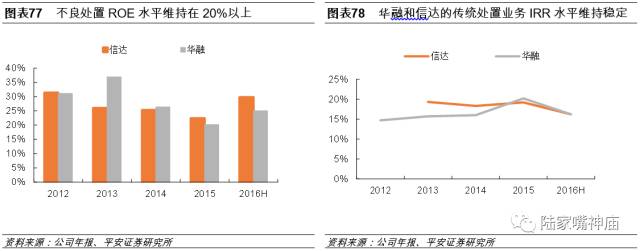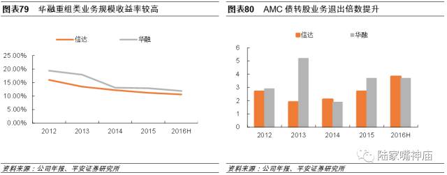 从附重组条件类不良资产经营模式来看,过去几年大约维持在11%-20%之间。但由于降息等影响出现了明显下滑的趋势,在16年两家的水平分别为11.9%和10.6%,这一水平也远高于银行目前一般信贷资产的收益率水平。