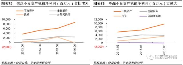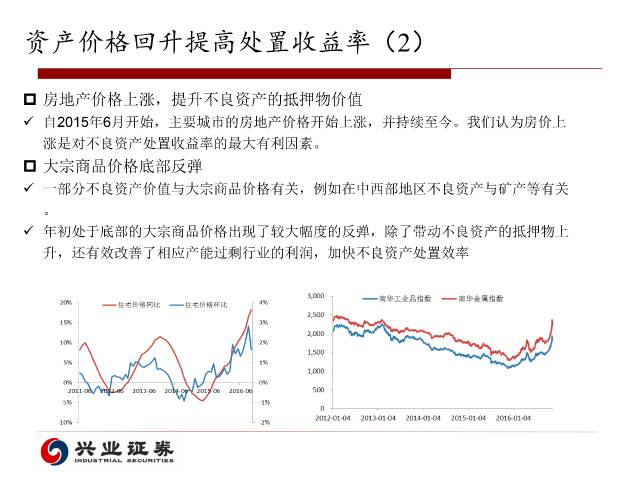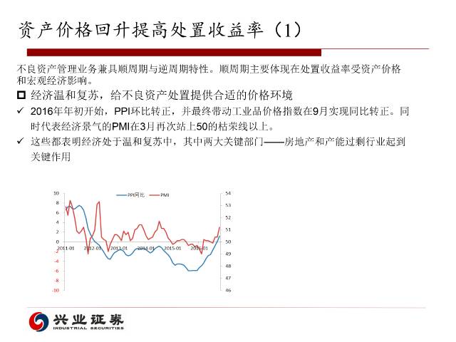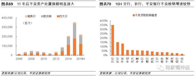 自上而下分析 ► 不良率绝对水平取决于经济增速,不良形成率(不良率的二阶导)取决于经济增速下滑的速度(经济的二阶导),而非直接取决于经济增速(图1)。 ► 中金宏观组预计明年名义GDP增速进一步反弹,如果成立,对银行意味着不良率绝对水平或见顶,而不仅仅是不良形成率回落。名义GDP增速从2011年二季度的19.7%下滑至2015年三季度的6.0%,不仅下滑,而且快速下滑(四年多下滑近14个百分点,平均每年下滑>3个百分点),但今年三季度已反弹至7.8%,中金宏观组预计明年进一步反弹至8.3%。 ► 即使明年名义GDP增速不反弹,只要不快速下滑,则银行不良形成率放缓的判断依然有宏观上的支撑。线性简单测算,只要明年名义GDP增速不下滑超过2011~2015年的平均下滑速度(每年超过3个百分点),即名义GDP增速跌破5%,则不良形成率依然大概率回落。 自下而上分析 ► 长三角是本轮不良周期的领先指标,领先全国约2年。长三角不良形成率2013年上半年见顶,而全国是2015年上半年。 ► 长三角不良率已于2015年下半年见顶,以2年时滞推算,2017年下半年全国不良率或见顶。 加回核销处置,银行已经确认的坏账水平接近5%,明显高于账面上直接披露的不良率(2%),详见我们9月12日的报告《银行确认和处置了多少坏账?》。 银行损益表上的信用成本不直接取决于不良率,而是不良形成率。不良形成率回落意味着银行真实信用成本有下降空间(尽管实际上银行或调节拨备覆盖率),进而推动银行真实盈利增速反弹。 二、平安证券:银行进军不良处置有何影响 来源:摘自陆家嘴神庙 作者:励雅敏 袁喆奇 王思敏 银行今年核销规模加大 在国内经济依然面临较大下行压力背景下,银行的不良率仍处在上行通道当中。不良贷款的不断累计与不良率的攀升让银行对改善资产质量问题有了更加急迫的需求。 从11年开始,各家上市银行不良处置规模开始不断攀升,在16年上半年,银行的不良资产处置规模较15年同期进一步上升,其中处置规模最大的为工行,达到421亿元。16年上半年不良资产处置规模进一步扩大,其中交行、农行和平安银行的不良处置规模增速超过100%,其余的银行该增速在12%~60%区间。 进军不良资产市场,提升估值水平 1)地方amc审批进程加快 在各地政府以及政策的推动下,地方AMC的审批进程加快,尤其是16年10月份,银监会放宽了“一个省可设立一家地方资产管理公司”的限制,允许省级人民政府增设一家地方AMC。截至11月30日,总计32家地方AMC公司已设立或已经获得筹建批复。 2)银行介入债转股领域 10月份国务院银行参与市场化债转股指引发布,使得银行可以通过设立机构参与债转股,银行对不良处置行业深度介入,从市场供给方成为参与主体。目前,四大行发起设立债转股处置机构,农业银行拟设立债转股子公司。此外,兴业银行旗下的兴业国信资产管理有限公司发起设立福建省第二家地方AMC已获福建省办公厅批准。 3)不良AMC行业景气度上行 我对于两大国有AMC公司(中国信达、中国华融)的不良资产处置业务进行分析发现,各项不良处置业务的报酬率及ROE水平与银行传统业务的收益率与ROE水平均有一定优势,因此我们认为如若银行未来能够作为不良资产的处置方参与进来,有利于抬升其目前较低的估值水平。 不良处置业务的利润贡献不断提升。尽管信达不良资产的16年上半年的营收增长主要来自金融服务,但从税前利润来看,两家AMC不良资产处置业务的利润贡献规模不断扩大,信达利润贡献占比从15年上半年的56.6%上升到16年上半年的81.7%,华融的不良处置业务利润的占比从15年上半年的51.6%上升到57.2%。 从债转股部分里来看,两家的债转股处置业务的收益退出倍数从14年都开始出现上升趋势, 16年上半年,两家的收益倍数水平分别为3.7x和3.8x,并在不断上升的过程中。 三、安信证券:AMC牌照稀缺空间庞大,关注民营参股机会