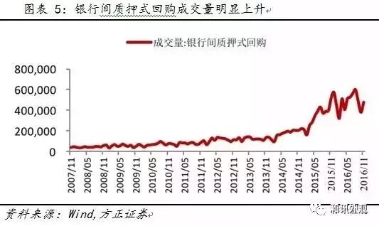这部分短期货币在银行间市场存在两个特性:一是这部分货币对银行来说是有成本的货币,因此银行存在比以往更高的动力去获取收益覆盖成本。于是很多货币就被加了杠杆,去博取短期的期限利差,我们看到银行间质押式回购的成交量自2015年起明显飙升,也显示出短期带成本的货币是促成高杠杆的重要条件;二是在银行的期限错配的监控下,这部分短期货币是很难去通过给企业放长贷等方式去支持实体扩张的,加之今年居民房贷对企业贷款存在挤出作用,导致在经济预期偏弱的情况下,给债券市场加杠杆是个偏安全的做法。