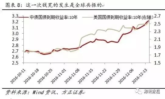 当前发生钱荒和债市调整的三个原因。一是过度套利后,同存和债券市场的利差快速缩窄,利差空间被抹平;二是经济L型企稳和通胀预期升温使得政策从稳增长转向去杠杆防风险,陆续出台锁短放长和表外理财纳入MPA等政策;三是美联储加息和特朗普“基建+减税+反移民”的再通胀政策导致全球流动性观点出现,外围债市收益率普遍上升,通过流动性和预期向国内债市传导。