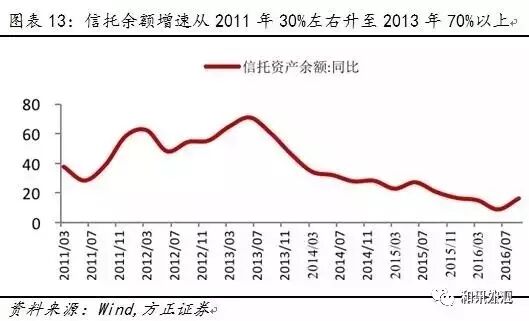 自2011年末开始的那轮货币宽松也引起了后来相当长一段时间的资金充裕,后验上的判断是:当时那轮发行的货币很多都进入了信托及票据领域,并且很多商业银行在通过资管通道及理财业务与非标对接。由于信托产品的流动性改善,信托余额增速也从2011年30%左右的位置一路升至2013年70%以上的高位。