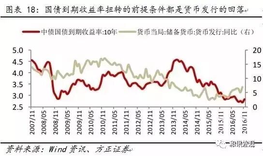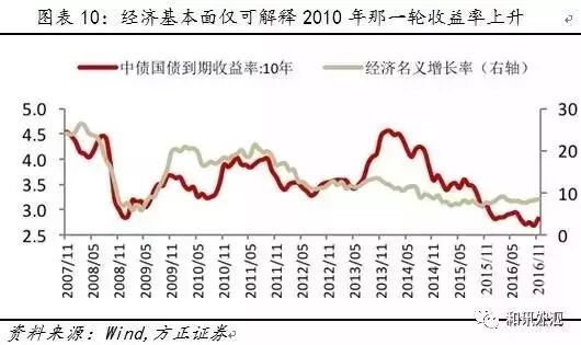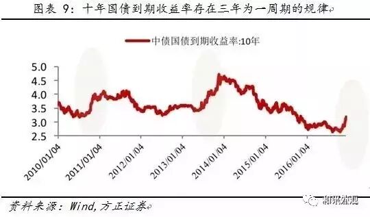 从10年期国债收益率的经验规律来看,三年一个周期的规律是明显的,过去的几年间收益率分别在2010年、2013年及2016年下半年出现了飙升。虽然表象是不同的(2010年下半年的收益率上升来自于通胀超预期,而2013年下半年虽有经济基本面的小幅好转,但更大程度上还是市场情绪的拐头、交易模式的限制和利率市场化预期推动的),但本质上仍然是流动性的原因。