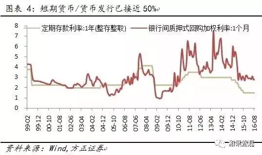 今年的货币环境相对于过往存在一个更有利于加杠杆的环境,就是短期货币的占比不断上升。与去年央行积极降准不同,今年以来,考虑到汇率贬值、资本流出压力、房价暴涨以及经济企稳,央行的主要投放手段由下调准备金率转为了相对温和的MLF和PSL,这导致了流动性体系中的短期货币比例明显增多。从数据来看,短期货币占整个货币发行的比例从去年四季度始就快速上升,目前已经达到了47%左右,目前银行所持有的货币,有接近一半是有成本的短期货币。