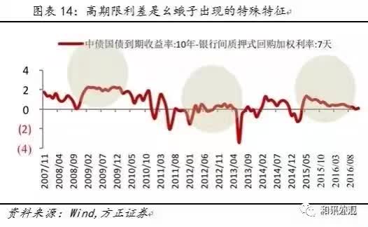 流动性周期是引致钱荒的深层次原因。利率上升周期历史上每三年一次,大多发生在流动性走宽阶段的末端。在资金无法继续进入增长领域后,往往会因当时的剩余流动性充裕和高期限利差等形态去炒作各种资产,并引起政策的严控。流动性表现在这几轮里不尽相同, 2010年是商品,2013年是非标,而今年则是委外和债券。