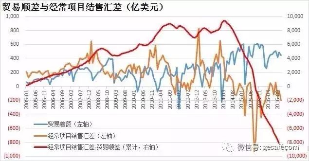 在人民币有升值预期的年份,企业及居民都倾向于尽量多持有人民币。如果把2005年作为一个起点,到2014年最高峰时期,贸易项下结售汇顺差比真实的贸易顺差多出了9000亿美元;随着贬值预期的到来,大家又一窝蜂的想多持有美元,并以差不多10倍于之前之前的速度,1年就抹平了过去9年积累的多结汇的部分,再1年贸易项下结售汇逆差就变成了将近9000亿。2年结售汇逆差将近1.8万亿。