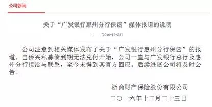 12月22日晚间,浙商财险发布了《关于侨兴私募债保证保险有关情况的说明》: 我司在2016年12月20日发出侨兴电讯、侨兴电信私募债保证保险公告后,受到大量投资者和媒体的关注,也得到了投资者和媒体的理解和支持,在此表示感谢。我司在侨兴电讯、侨兴电信私募债违约后,第一时间成立了由高管、律师、专业人员组成的专项工作小组,全力以赴地处理这起理赔案件。现就大家关心的问题做出说明如下: 关于补充资料通知的说明 第一,侨兴电讯、侨兴电信私募债保证保险为涉及互联网产品的保证保险业务,与传统保险业务具有较大区别。 第二,被保险人数量众多,索赔材料数量较多,还存在部分投资人已“变现”的复杂情况,增加了我司理赔审核的难度。 第三,侨兴电讯、侨兴电信私募债保证保险业务交易结构复杂,法律关系复杂,我司需要专业人士投入大量时间进行研究。 第四,根据《保险法》规定,保险人只有一次机会要求补充提供理赔资料。 鉴于上述原因,我司需要全面、细致地审核投保索赔资料,并一次性通知补充提供理赔资料,确保被保险人的合法权益。 关于风控措施和偿付能力的说明 侨兴电讯、侨兴电信私募债保证保险业务中,侨兴集团董事长吴瑞林向我司提供个人无限连带责任担保,某金融机构出具了履约保函。 此外,有媒体咨询我司是否已经获得侨兴6亿资产抵押。12月19日,我司已向相关政府主管部门递交办理侨兴不动产抵押登记申请。截至目前,我司尚未取得相应的他项权证。后期能否取得,存在较大的不确定性。 截至2016年3季度末,我司偿付能力充足率为266.24%,符合保险监管要求。 此类涉及互联网产品的保证保险业务理赔,牵涉被保险人数量多,交易结构复杂,与常规的理赔有所不同。希望社会各界能理性看待此次理赔案件,不要把正常的理赔工作看成拖延、扯皮甚至推诿。 浙商财产保险股份有限公司 二零一六年十二月二十二日 公告中阐述了几项困难,看起来意思就是求给点时间,但关于风控措施和偿付能力的内容 “某金融机构出具了履约保函”本来是想给个定心丸,却万万没想到出事情了。 某金融机构是谁? 第二天(12月23日),浙商财险就在一早在官网上发布了《关于“广发银行惠州分行保函”媒体报道的说明》,其实明说了就是广发银行。 那么,这个广发银行惠州分行保函媒体报道是什么呢?证券时报旗下的微信公众平台券商中国(quanshangcn)在12月22日晚间发布了《债券违约又见萝卜章!浙商财险拿了假保函,广发银行紧急报案》。报道称: 券商中国记者独家获悉,浙商保险近期拿着一份抬头为“广发银行惠州分行”开具的保函,找到广发银行实施反担保赔偿请求时,广发银行验证发现该保函为假,立即报了案。 另据澎湃新闻,12月23日早间,广发银行惠州分行相关负责人向澎湃新闻表示:“事件发生后,我分行高度重视,立即组织人员开展调查,经查验、核实,该保函非我行出具,为不法分子假冒我行名义出具的虚假银行履约保函。目前我分行已将情况报上级主管单位、当地监管部门和政府主管部门,并已向当地公安机关报案。” 何为履约保函呢? 简单的来讲,要先拿钱给银行,买方向银行提出履约保函申请,银行会认真审查,同意后以银行的名义开出履约保函,承诺以银行的名义提供资金担保,在保函有效期内,如果卖方有保函中约定的违约情况出现,买方可直接从银行拿走这钱。履约保函可以让保险公司向第三方追偿,锁定自己的风险,银行出具的保函就是反担保措施中的一种。 招财宝为了增强安全性,引入浙商财险做私募债的本息赔付保障,但浙商财险担心搞不定,毕竟自己不是前海土豪啊,风险敞口又这么大,就找了广发银行做履约保函,如果债务违约,就由广发银行来赔。有媒体消息称,是全额本息担保。 问题来了,根据目前的媒体报道,这个履约保函极有可能,是假的。 目前主要问题有二,第一,这假保函是什么情况啊?等待公安机关的调查。第二,站在等待还款投资者的角度,这个事情关我们什么事? 援引澎湃新闻:对北京市理格丰律师事务所合伙人、中国保险资产管理业协会法律专家郭玉涛向澎湃新闻表示,从最终赔付的角度来说,保函真假与否并不影响浙商财险所应承担的担保责任。 侨兴集团的反应 12月22日来自新浪财经的消息称: 不过,12月22日上午,侨兴电信一位内部人士透露,实际上,这几天内侨兴电信已向浙商财险抵押6亿币的固定资产,协助浙商财险对投资人进行保险赔付。 然而从浙商财险的公告中并没有看出什么乐观的情绪:此外,有媒体咨询我司是否已经获得侨兴6亿资产抵押。12月19日,我司已向相关政府主管部门递交办理侨兴不动产抵押登记申请。截至目前,我司尚未取得相应的他项权证。后期能否取得,存在较大的不确定性。 但其实感觉事情没有那么简单,侨兴集团是在惠州的,牵扯到的机构是广州银行惠州分行,有媒体报道又称该保函是全额本息担保。小编想多了有点怕,还是不说了。