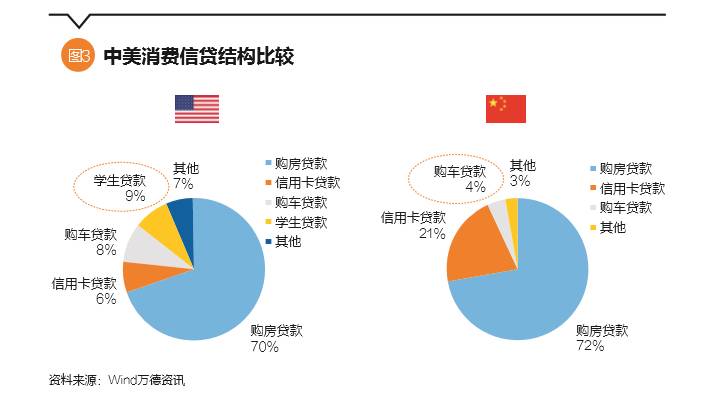 在中美信贷结构比较方面:对比中美的信贷结构,可从消费信贷、房产信贷以及中小微信贷等看出中美信贷市场的区别:美国有一类“学生贷款”占了信贷规模的9%,中国目前也有几家平台在做学生信贷,但模式和美国完全不同,中国学生以消费贷款为主,美国学生信贷以助学贷款为主,之前爆出的大学生开“裸条”贷款,催收后跳楼等现象说明了中国目前的学生信贷市场很不成熟。还有一个明显的差异是在汽车贷款领域,在美国占比8%,中国占比4%,中国整个汽车市场保有量突破了1.5亿台,新车销售的金融渗透率还会进一步上升,二手车2015年的交易量接近1000万台(去除重复交易估计为400万台),金融渗透率估计在10%左右,市场才刚刚起步。中国的消费信贷渗透率在不断上升,目前在20%左右,低于美国和韩国的水平,未来还有巨大的发展空间,尤其是针对目前没有信用卡的蓝领人群。
