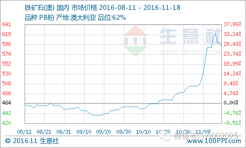 11月第三周,大宗商品市场开始降温,随着期货市场多个主力品种的跌停,国内现货市场也呈现出退烧迹象。生意社大宗58榜显示,2016年第46周有60.34%的商品上涨,34.38%下跌,另5.17%持平。环比来看,上涨商品比例减少近三成(前一周有87.93%的商品上涨,仅有10.34%下跌),不仅如此,该周市场均涨幅也大幅收缩,此前一周市场均涨幅为2.7%,而上周仅有0.63%,大宗商品价格指数BPI也呈现滞涨,自11月15日触及年内最高点806点后,此后几天一直停留在此再无上涨。分析人士表示,不论从商品上涨比例还是均涨跌幅来看,过去一周的大宗商品市场似乎开始摆脱“疯狂”,回归理性。