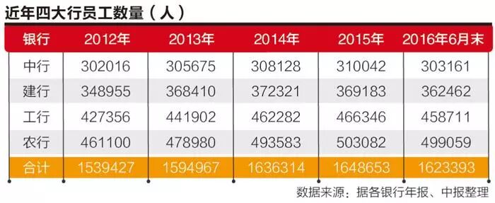 2016年,四大行员工总人数自2007年以来首度减少(自2007年公布该数据)。截至2016年6月末,四大行员工合计162.34万人,相比2015年末减少2.53万人。