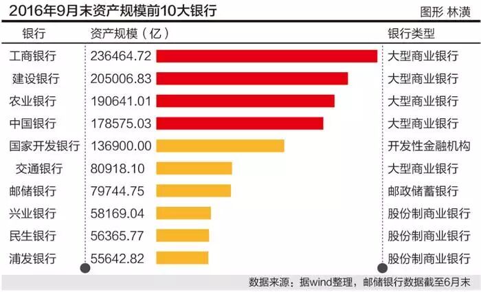 工商银行依然是中国资产规模最大的银行。2016年9月末,工行资产规模为23.64万亿,约占银行业资产的十分之一。与2015年年末相比,股份行资产规模位次发生较大变化。其中,2016年9月末,兴业银行超越招商银行成为股份行资产规模最大的银行;民生银行超越招商、浦发、中信成为股份行资产规模第二大的银行;浦发列股份行资产规模第三,招行列第四。