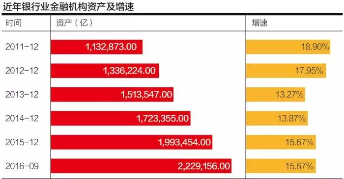 根据银监会披露的数据,2016年3月末,中国银行业金融机构境内外本外币资产总额首度突破200万亿大关。截至2016年9月末,中国银行业金融机构境内外本外币资产总额为222.9万亿元,相比2011年末翻了一番。