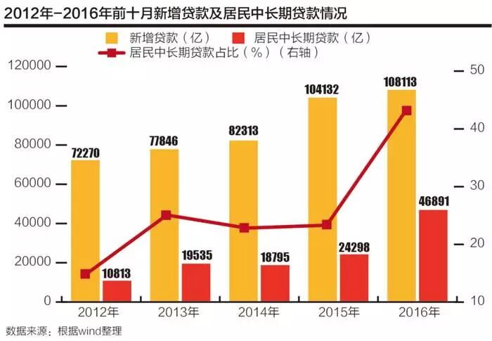 根据中国人民银行公布的数据,2016年1-10月居民部门新增中长期贷款(主要为居民按揭贷款)为4.69万亿,相比2015年同期高2.26万亿,创历史新高。从占比看,2016年1-10月居民部门新增中长期贷款占同期新增信贷的比重高达43.37%,相比此前最高值还高18个百分点。