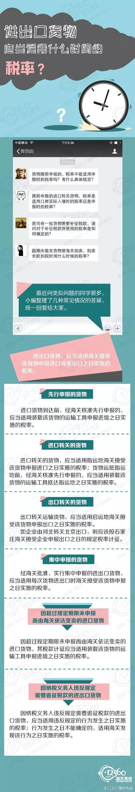 提前申报的货物,税率不能适用申报时的税率吗?补征税款时使用的税率是如何确定的?超期未报关货物拍卖后的余款扣税时用什么时候的税率?最近问“税率适用时间”问题的同学很多,小编整理了几种常见情况的答案,统一回复给大家。详见下图: