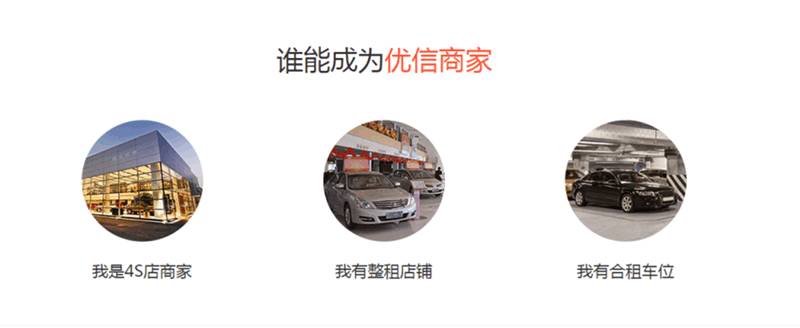 优信商家需要具有线下的实体店或合租车位等线下设施放可入驻,并向商家提供免费上门发车以及免费检测服务,对认证车商的车辆向买家提供优信的质保服务。