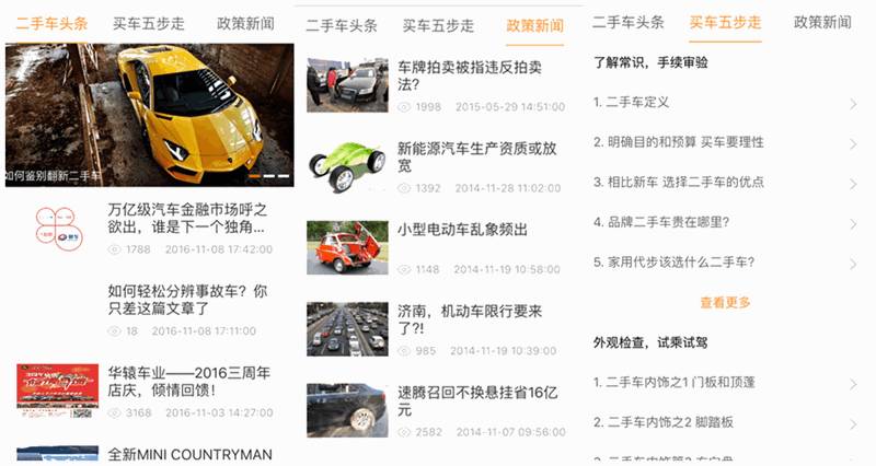 易车二手车在内容栏目方面大致分为:二手车头条、买车五步走、政策新闻三大板块。区别于二手车之家,易车二手车并未将易车网的二手车论坛板块移植到app中,在内容丰富程度方面略少于汽车之家。