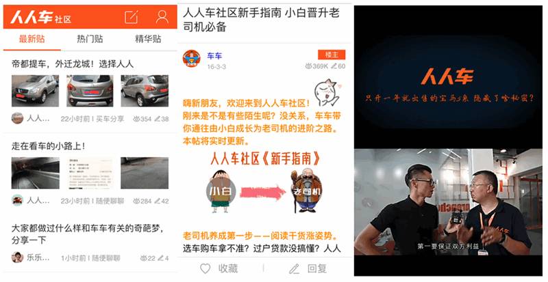 人人车在内容产品的布局更倾向社区化运营方向,用户可以自己发布帖子分享用车经验而编辑则通过不断的更新文章、管理论坛来提供最优质的内容,在视频方面人人车与行业内KOL:如陈震、初晓敏等合作参与视频栏目录制,从而吸引了大量粉丝的加入。