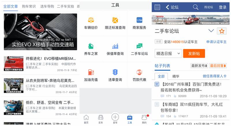 内容层面汽车之家维度更广,内容更丰富,二手车之家内容大致分为:购车常识、选车导购、二手车实拍、政策法规、行业资讯5大板块。并在app端实现与PC二手车论坛板块的打通。