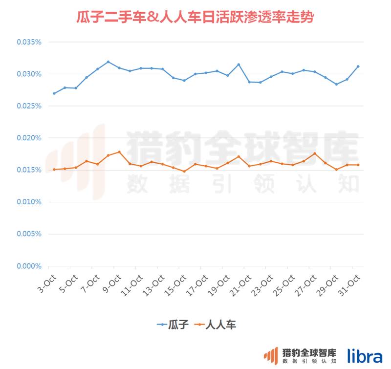 以两家C2C二手车平台为代表,通过对比发现在10月的日活跃渗透率趋势上两家二手车平台的活跃度波动呈现出了一致性,周末的时间二手车app的日活跃渗透率更高。