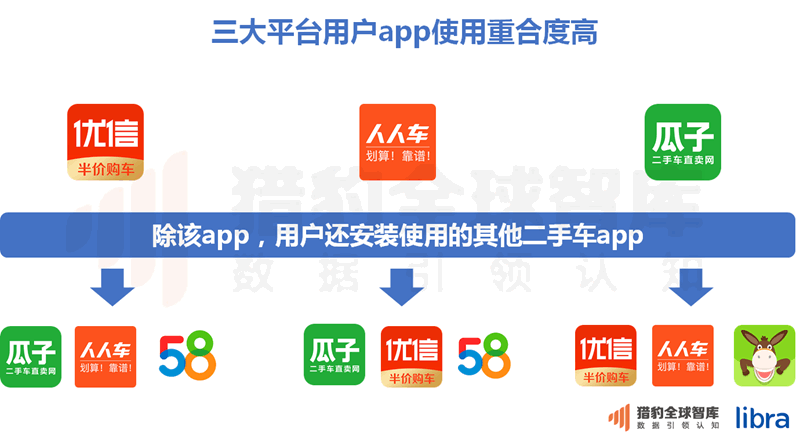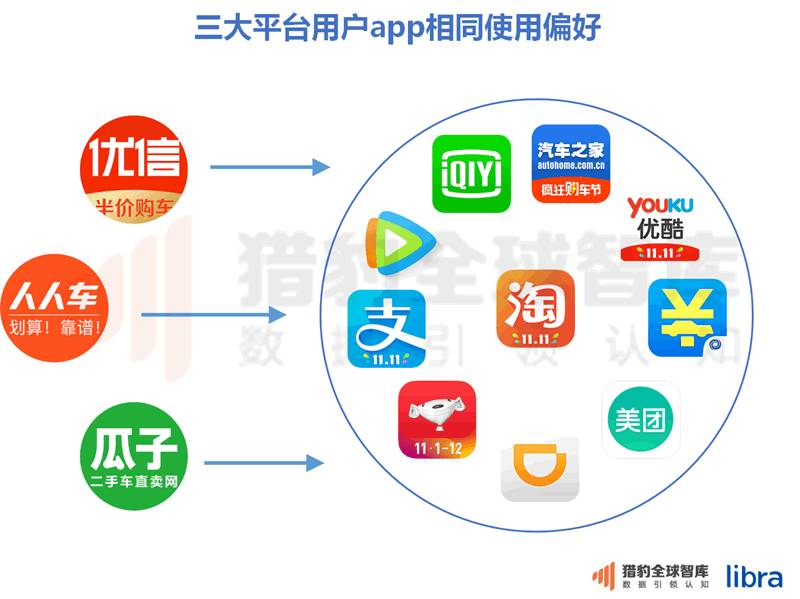 以优信、人人车、瓜子三款二手车直卖平台为例,通过观察三款app用户的常用app使用习惯寻找二手车app的用户的喜好,寻找其中的共性与不同。
