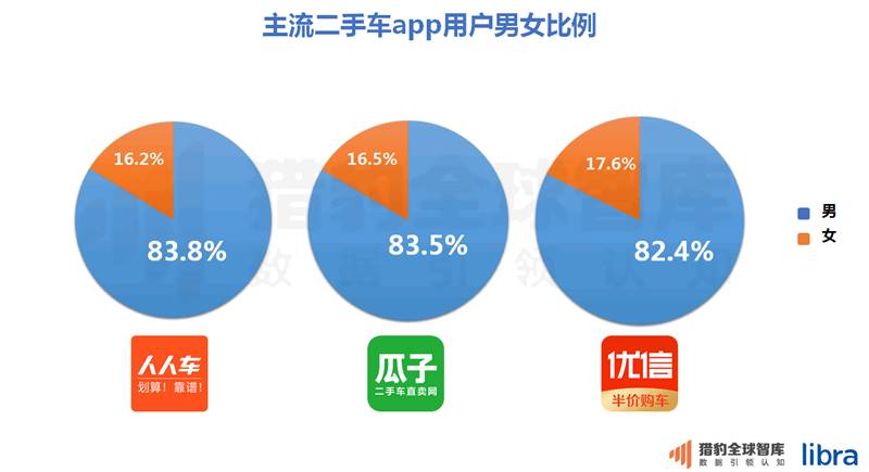 根据libra数据显示,人人车、瓜子、优信三款app的用户性别分布,男性用户至少占82%的份额,占据了绝对的多数。由此可见,男性用户更易接受选购二手车,而女性用户现在对二手车还并不感冒。
