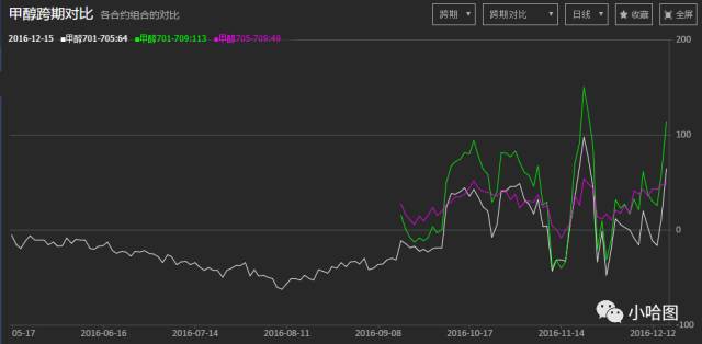 也正因于此,甲醇10月以来的这波上涨潮,表征进口状况的港口库存急剧下降提供了最好的注脚。当然纸货炒作以及暴力的资金也在推波助澜。而基本面的分歧与资金的乱窜也在跨期合约上也留下了暴力的痕迹