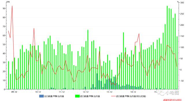 而自从中国MTO崛起之后,原来那点微不足道的出口就更加可以忽略不计了,2015年以后基本全部为进口。
