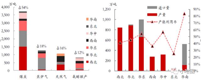 从2015年的产能分布看,甲醇的四种产能中,煤炭作为相对低成本产能占据了半壁江山。然而煤炭的出身并没有保证其低廉的成本,除了内蒙古、陕西、山西、宁夏、新疆、青海等煤炭产地之外,包括河南、山东乃至江浙一带也有部分煤头产能,非西北地区煤头相对成本的劣势叠加煤价的上涨,使得这部分产能不仅毫无优势可言,反而在高煤价的成本泥沼里举步维艰。