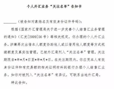 2. 外汇局对以向他人借用额度等方式规避额度的个人,列入“关注名单”管理,并通过银行以《个人外汇业务“关注名单”告知书》予以告知: