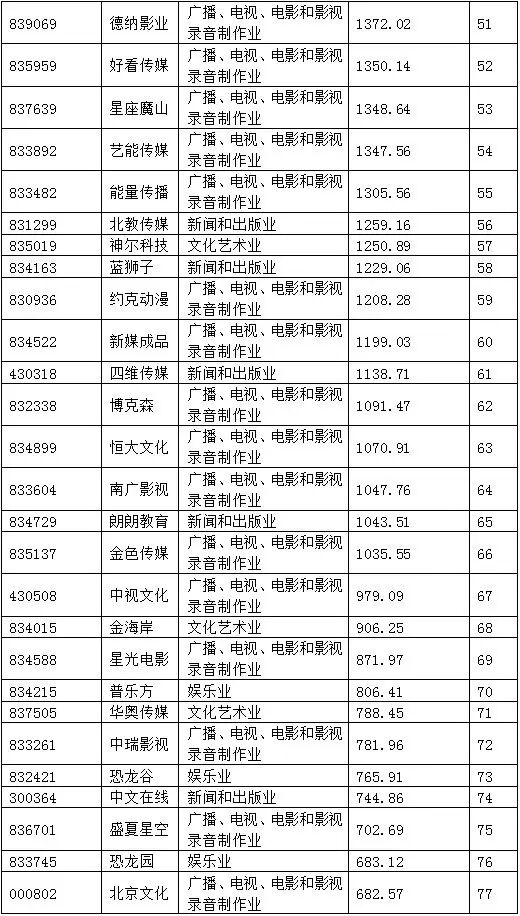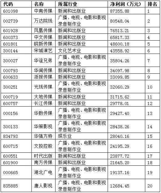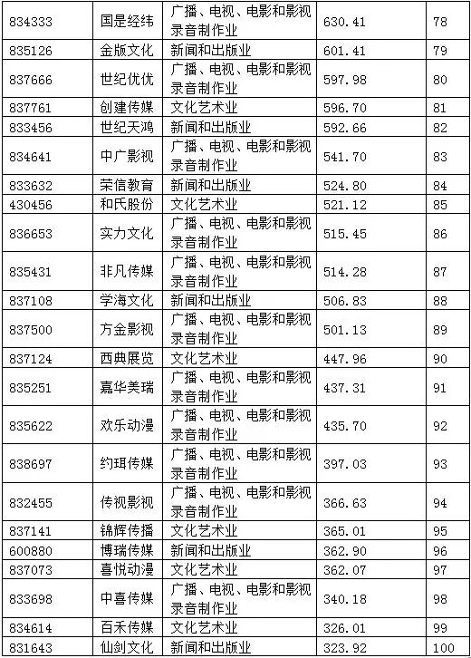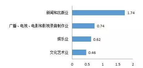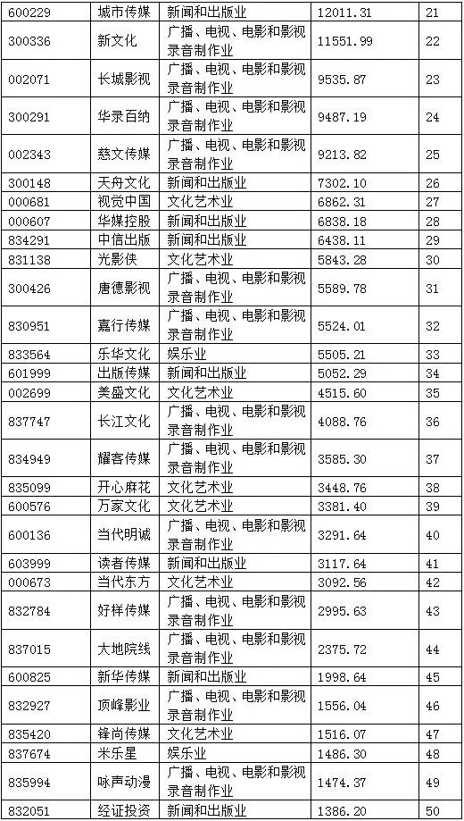 百强榜企业中新闻和出版业上市(挂牌)公司净利润之和为50.50亿元,平均净利润为1.74亿元;广播、电视、电影和影视录音制作业上市(挂牌)公司净利润之和为35.52亿元,平均净利润为0.74亿元;文化艺术业上市(挂牌)公司净利润之和为7.78亿元,平均净利润为0.46亿元;娱乐业上市(挂牌)公司净利润之和为3.73亿元,平均净利润为0.62亿元。