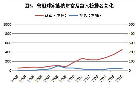 排名保持稳定者的典型有鲁冠球。2003年,鲁冠球以52.4亿元的财富排在第2位,2016年,其财富已膨胀至450亿元,而排名仅稍跌至第21位(图5)。鲁冠球的排名虽说有所波动,但从未跌出前50位。类似的还有卢志强、刘永好、刘永行、郭广昌、许荣茂等人,几乎始终在前50位之内小幅变动。这背后有哪些共同的因素作用呢?