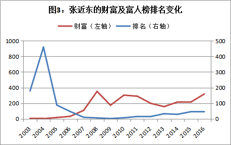 富人榜2003年的入榜门槛为2亿元,2016年已提升至65亿元,据此计算,中国最富500富人的财富年均增速约为30%。相对这一“大盘指数”,连续14年上榜的常青树富人,呈现出三种典型的变化:有人财富增速大幅超越大盘,排名迅速蹿升;有人排名始终保持稳定;有人财富虽然缓慢爬升,在富人榜中的地位却每况愈下(表2)。而这种变化轨迹的分化,某种程度上也体现出这个顶尖群体禀赋与能力的差异。