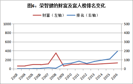 作为中国民族资本第一家族的荣氏家族,祖上留有遗训称:固守稳健、谨慎行事、绝不投机。荣智健执掌的中信泰富却重资本运作而轻实业经营,其中不乏投机行为,一着不慎即从首富滑落到了第200位(图6)。